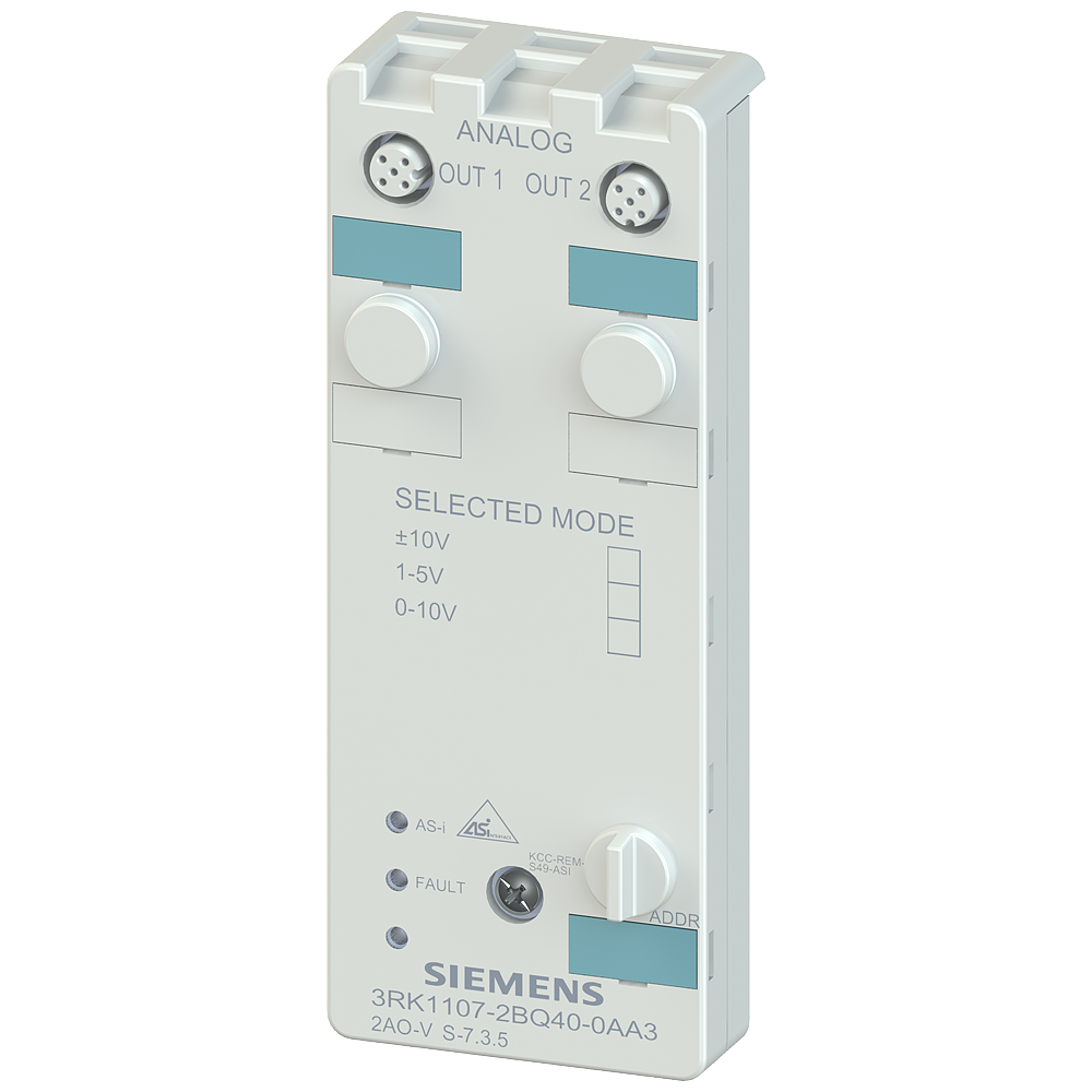 AS-i compact module K60 analog 2 AQ, IP67 2x 1 output, Voltage +/- 10 V 1..5 V for 2-wire actuators 2 x M12 socket Mounting plate 3RK1901-0CA00 must be ordered separately