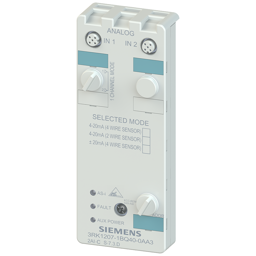 AS-i compact module K60 analog 2 AI, IP67 2 x input, current 4..20 mA, +/- 20 mA for 4-wire sensors 2 x M12 socket Mounting plate 3RK1901-0CA00 must be ordered separately