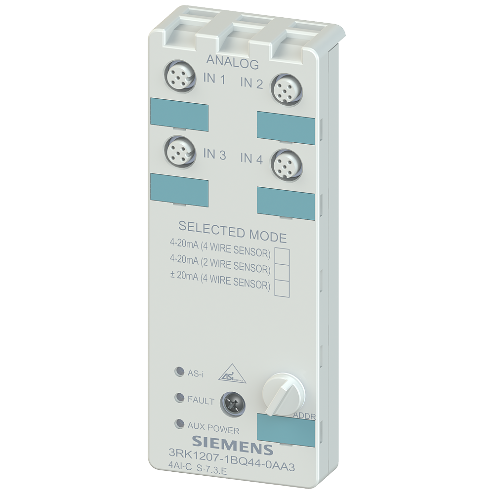 AS-i compact module K60 analog 4 AI, IP67 4 x input, current 4..20 mA, +/- 20 mA for 4-wire sensors 4 x M12 socket Mounting plate 3RK1901-0CA00 must be ordered separately