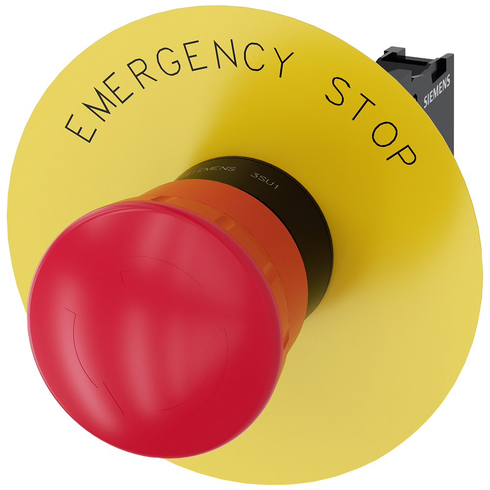 EMERGENCY STOP mushroom pushbutton, 22 mm, round, plastic, red, 40 mm, positive latching, acc. to EN ISO 13850, rotate-to-unlatch, with yellow backing plate, inscription: EMERGENCY STOP, with holder, 1 NC, screw terminal
