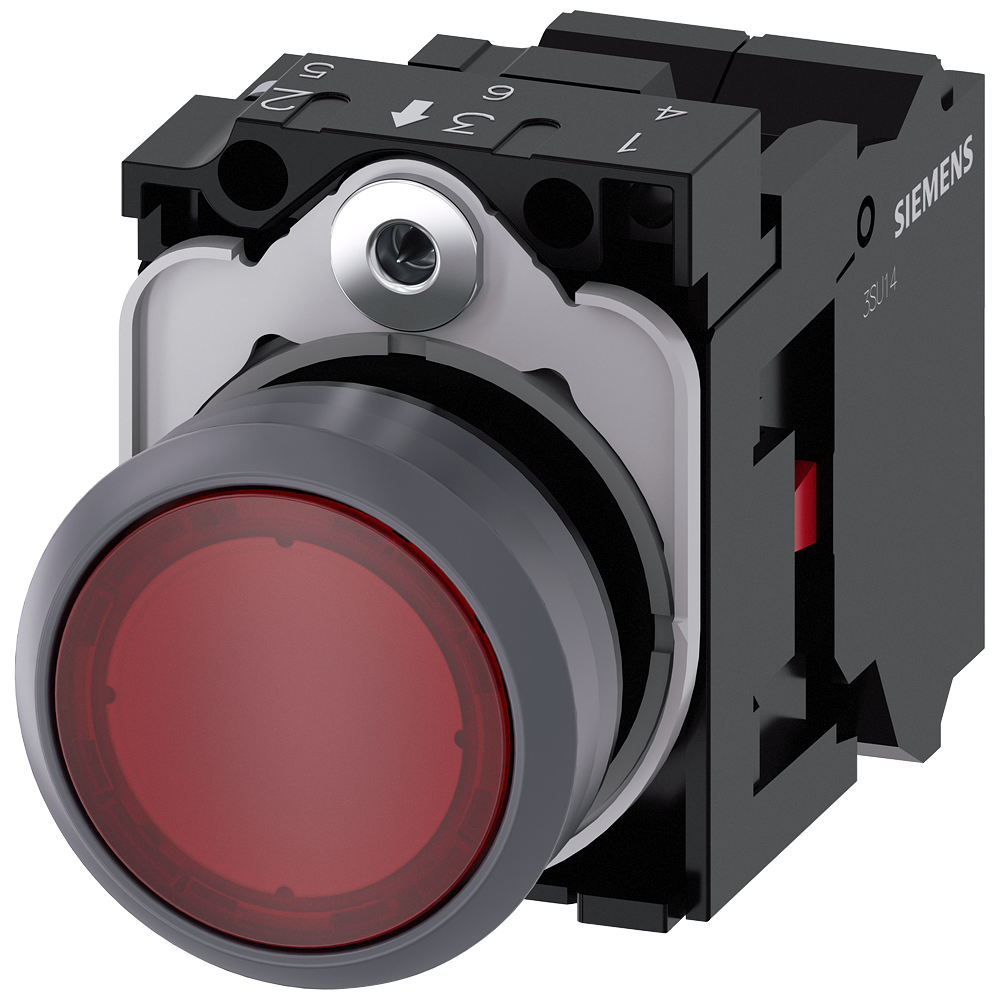 Illuminated pushbutton, 22 mm, round, plastic with metal front ring, red, pushbutton, flat, momentary contact type, with holder, 1 NC, LED module with integrated LED 24 V AC/DC, Spring-type terminal