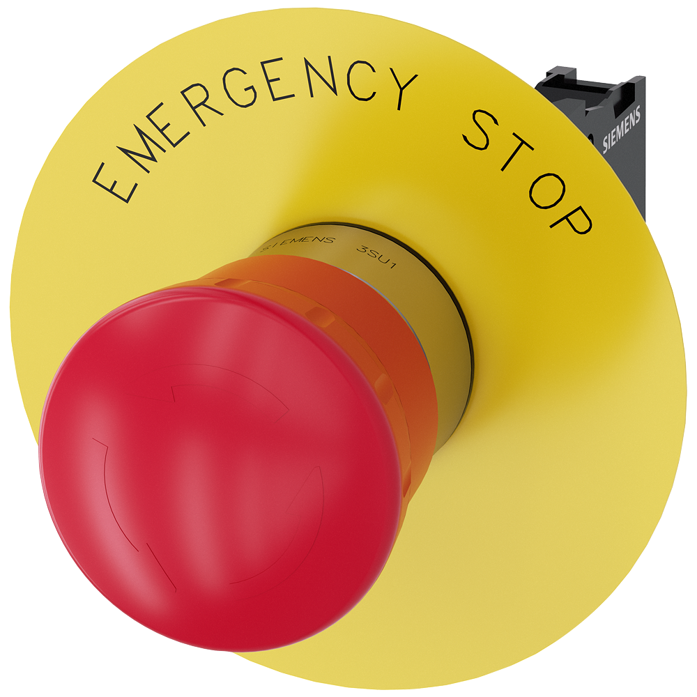 EMERGENCY STOP mushroom pushbutton, 22 mm, round, metal, shiny, red, 40 mm, positive latching, acc. to EN ISO 13850, rotate-to-unlatch, with yellow backing plate, inscription: EMERGENCY STOP, with holder, 1 NC, screw terminal
