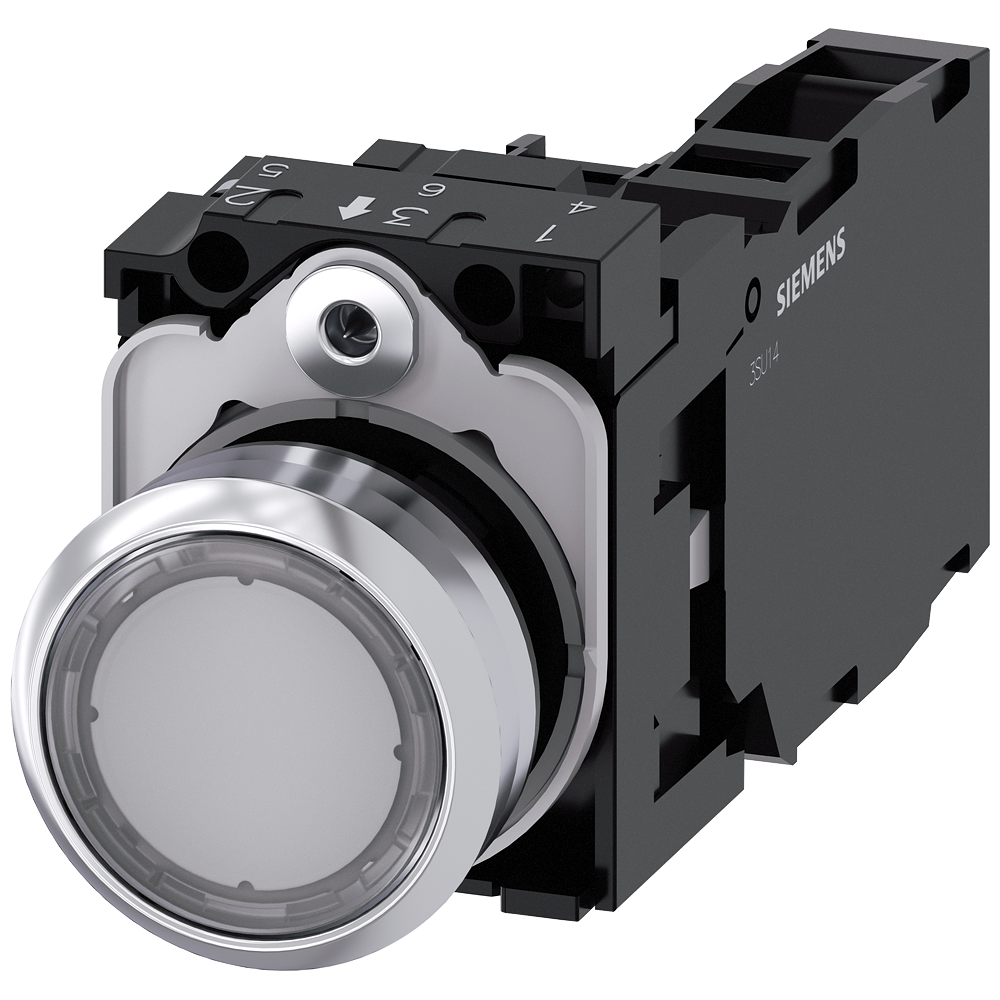 Illuminated pushbutton, 22 mm, round, metal, shiny, clear, pushbutton, flat, momentary contact type, with holder, 1 NO+1 NC, LED module with integrated LED 24 V AC/DC, screw terminal