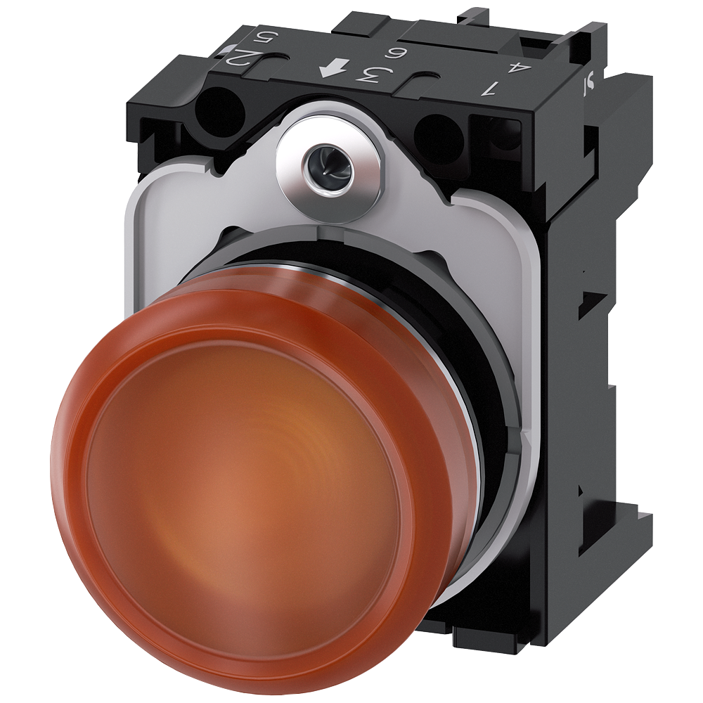Indicator lights, 22 mm, round, metal, shiny, amber, lens, smooth, with holder, LED module with integrated LED 24 V AC/DC, screw terminal