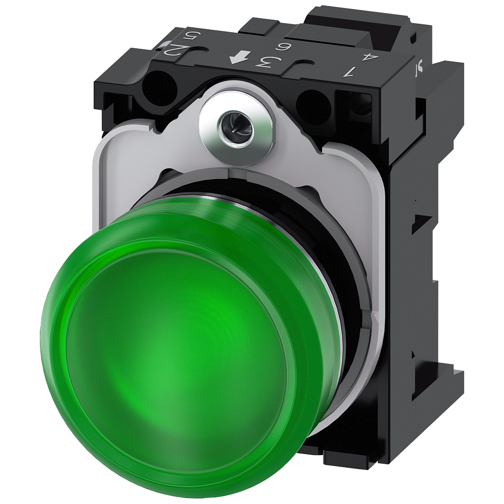 Indicator lights, 22 mm, round, metal, shiny, green, lens, smooth, with holder, LED module with integrated LED 24 V AC/DC, Spring-type terminal