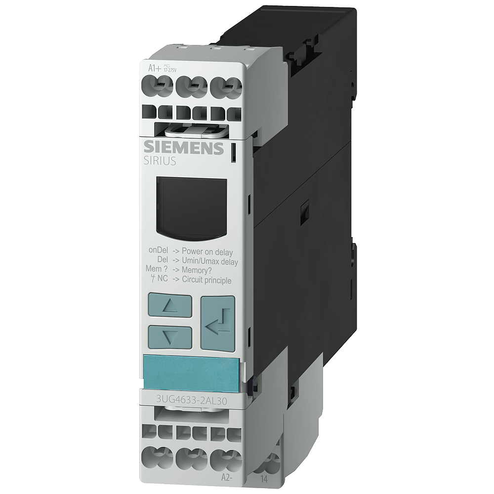 Digital monitoring relay Voltage monitoring, 22.5 mm from 17-275 V AC/DC Overshoot and undershoot Self-powered Spike delay 0.1 to 20 s Hysteresis 0.1 to 150 V 1 CO contact With or without error buffer Screw terminals Successor product for 3UG3534, 3UG3535