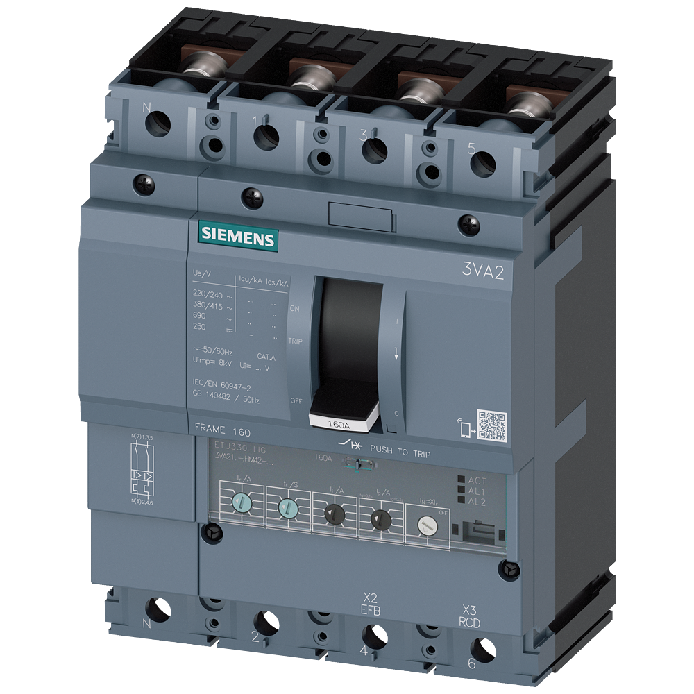 circuit breaker 3VA2 IEC Frame 160 breaking capacity class H Icu=85 kA @ 415 V 4-pole, line protection ETU330, LIG, In=160 A overload protection Ir=63 A...160 A short-circuit protection Ii=1.5...10 x In neutral conductor protection adjustable (OFF, 50%, 100%) ground-fault protection Ig=0.2...1 x In= tg=0.1/0.3s nut keeper kit