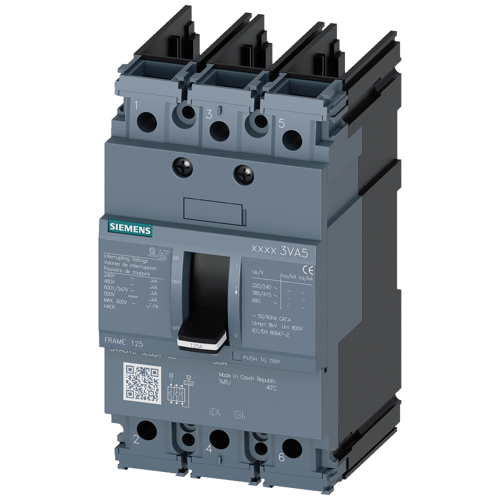 circuit breaker 3VA5 UL Frame 125 breaking capacity class M 35 kA @ 480 V 3-pole, line protection TM210, FTFM, In=125 A overload protection Ir=125 A permanently set short-circuit protection Ii=10 x In without connection