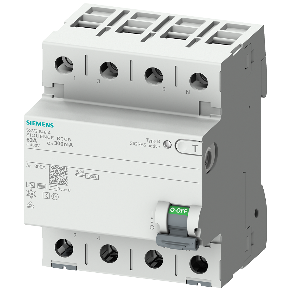 residual current operated circuit breaker, 4-pole, type B, short-time-delayed, In: 63 A, 30 mA, Un AC: 400 V SIGRES: harsh ambient conditions, extended test interval