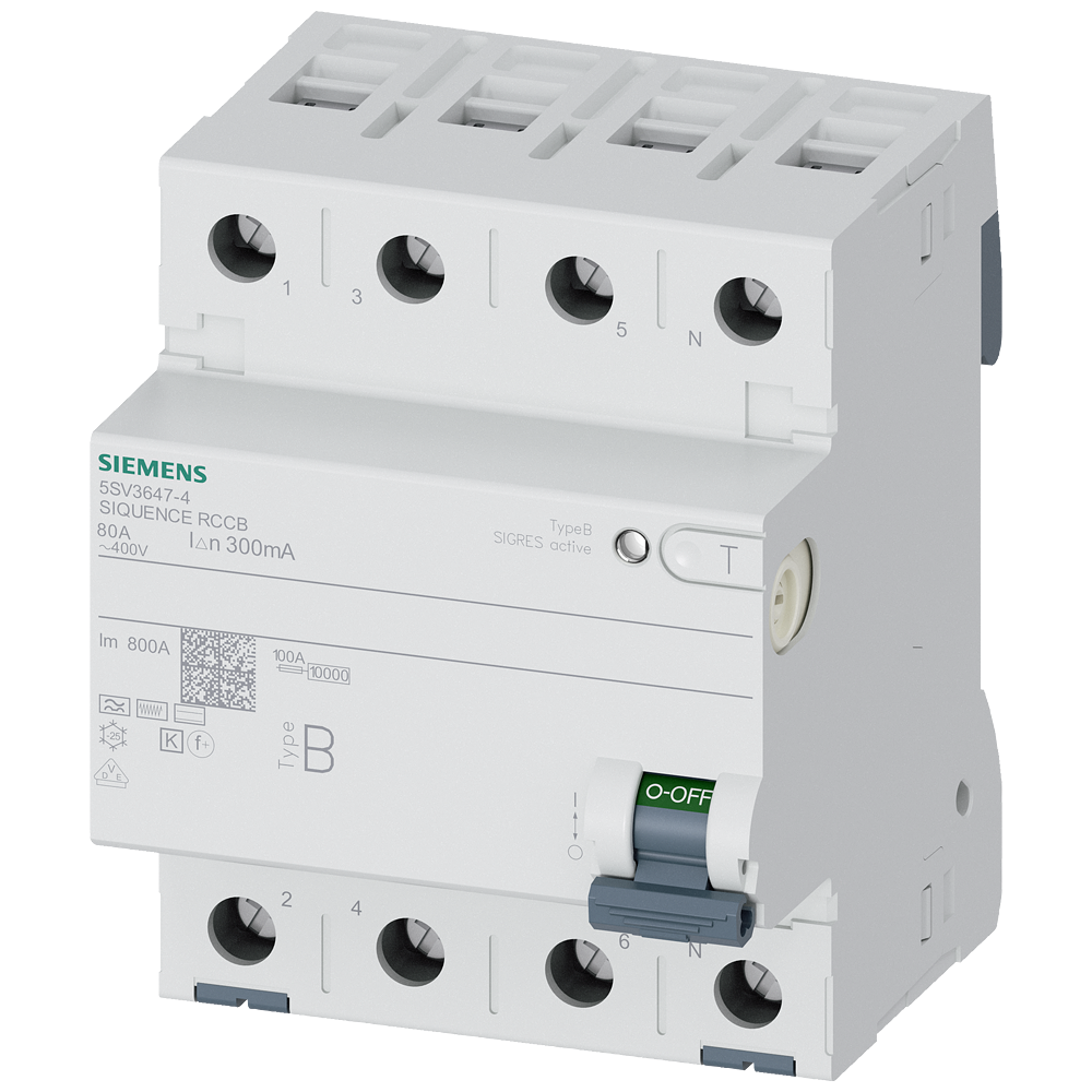 residual current operated circuit breaker, 4-pole, type B, short-time-delayed, In: 80 A, 300 mA, Un AC: 400 V SIGRES: harsh ambient conditions, extended test interval