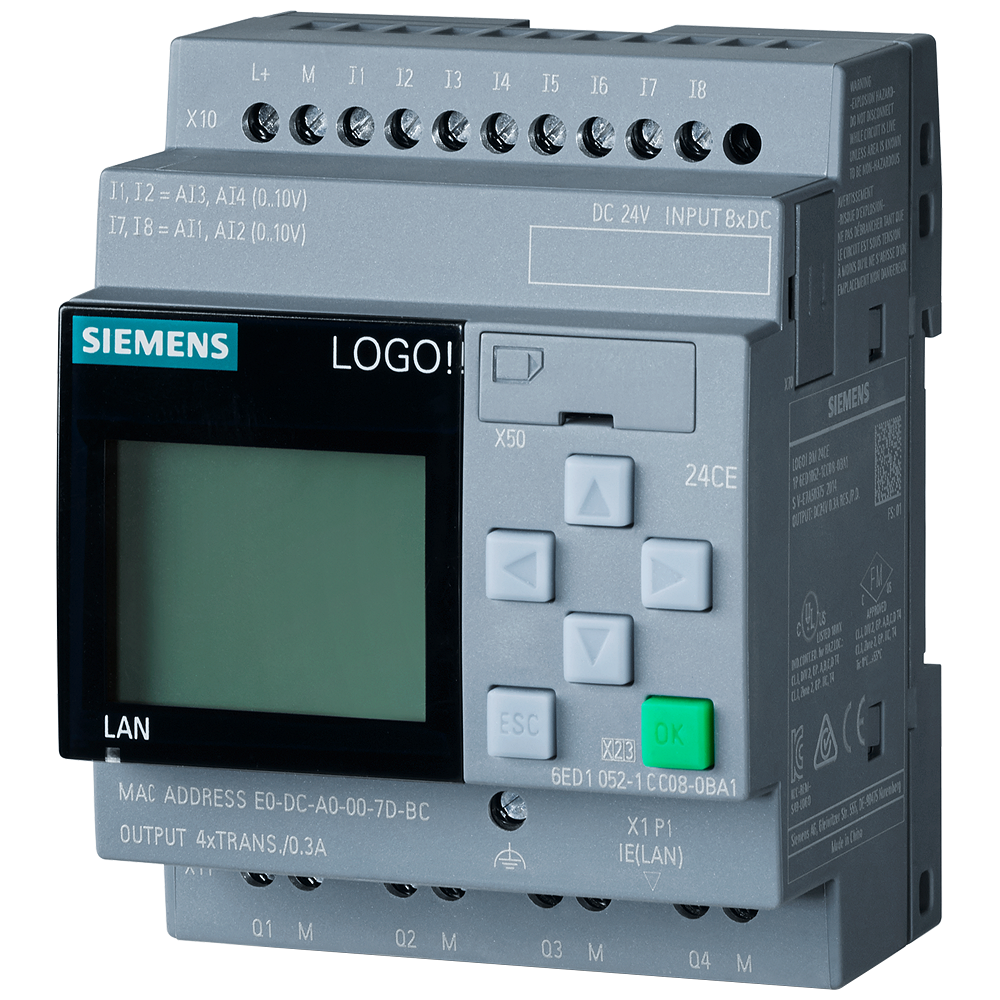 SIPLUS LOGO! 24CE based on 6ED1052-1CC08-0BA1 with conformal coating, -25…+60 °C, start up -20 °C, logic module, display power supply / I/O: 24 V/24 V/24 V trans., 8 DI (4 AI)/4 DQ, memory 400 blocks, modularly expandable, Ethernet integrated web server, data log, user-defined web pages, standard microSD card for LOGO! Soft Comfort V8.3 or higher older projects executable cloud connection in all LOGO! 8.3 basic units