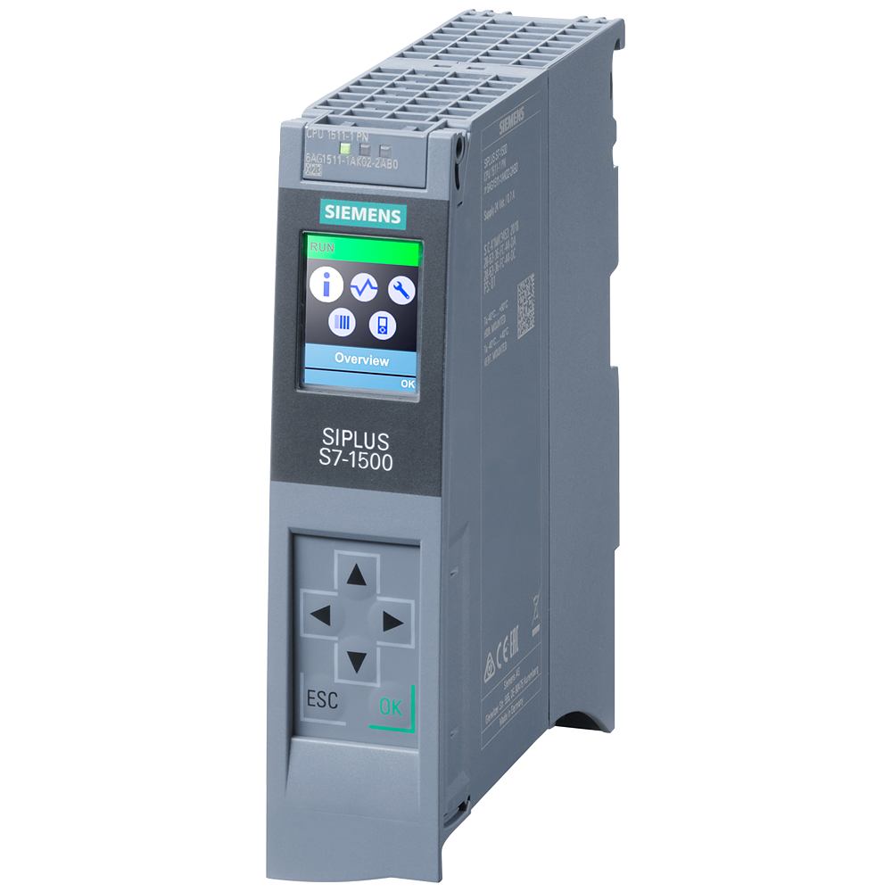 SIPLUS S7-1500 CPU 1511-1 PN based on 6ES7511-1AK02-0AB0 with conformal coating, -40…+60 °C, central processing unit with work memory 150 KB for program and 1 MB for data, 1st interface: PROFINET IRT with 2-port switch, 60 ns bit performance, SIMATIC Memory Card required spare part display: 6AG1591-1AB00-2AA0