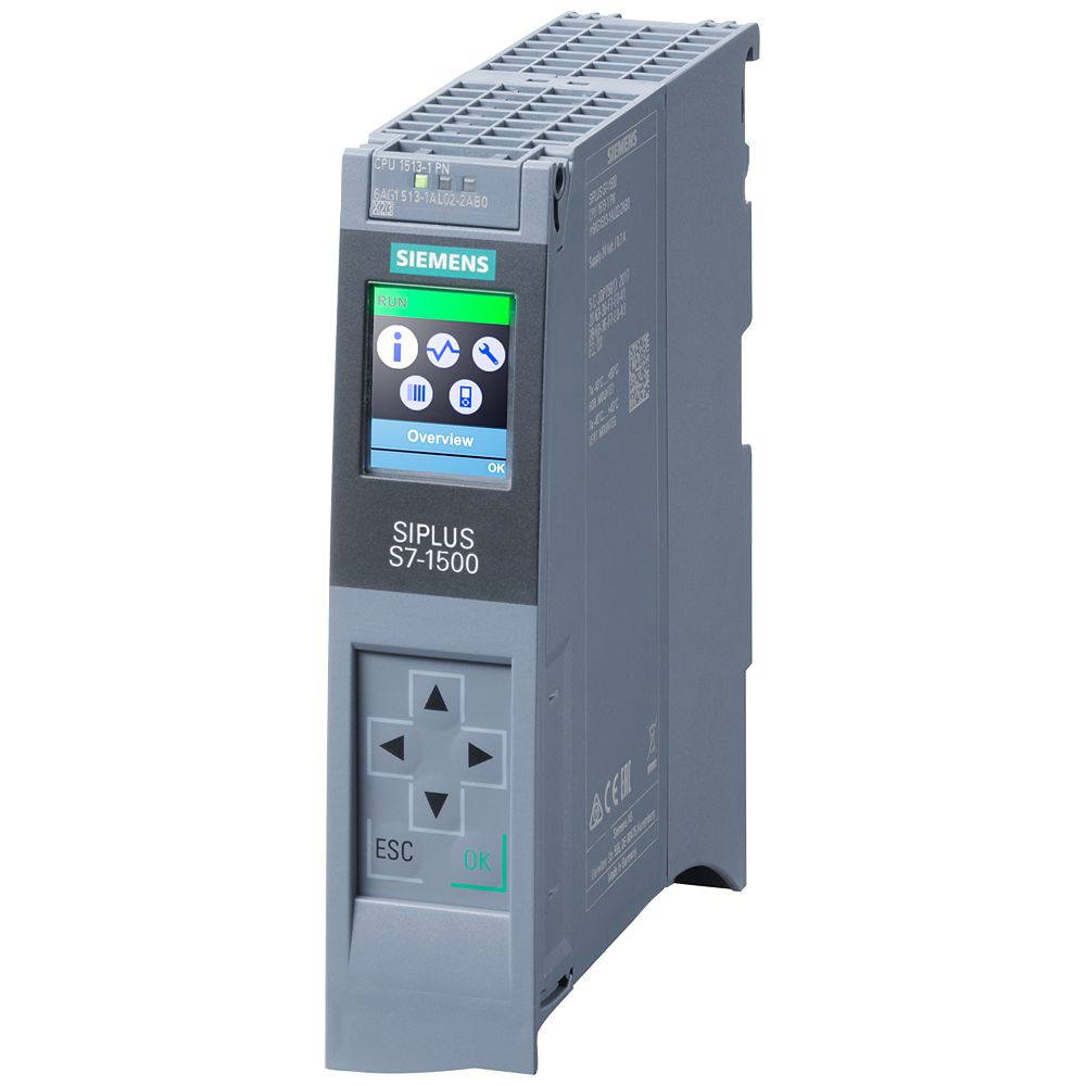SIPLUS S7-1500 CPU 1513-1 PN based on 6ES7513-1AL02-0AB0 with conformal coating, -40…+60 °C, central processing unit with work memory 300 KB for program and 1.5 MB for data, 1st interface: PROFINET IRT with 2-port switch, 40 ns bit performance, SIMATIC Memory Card required spare part display: 6AG1591-1AB00-2AA0