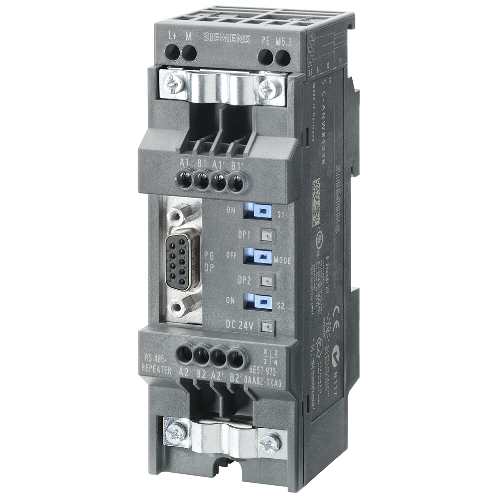 SIPLUS DP RS-485 repeater based on 6ES7972-0AA02-0XA0 with conformal coating, -25…+70 °C, for connection of PROFIBUS/MPI bus systems with max. 31 nodes max. baud rate 12 Mbps, degree of protection IP20