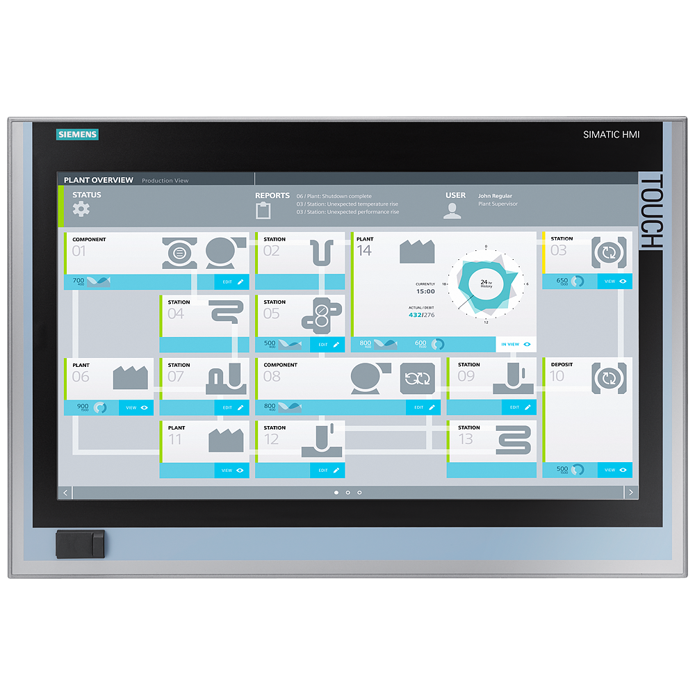 SIMATIC IPC677D (Panel PC), 2x10/100/1000 Mbit/s Ethernet; 4x USB V3.0, 1x serial (COM1); Watchdog, temperature and Fan monitoring; RAID controller onboard; 15" Touch (1280x 800); with front USB Celeron G1820TE (2C/2T, 2.2 GHz, 2 MB cache) 500 GB HDD SATA; DVD +/-RW; 2 GB DDR3 1600 DIMM; 2x PCI without expansion (HW) Windows 7 Ultimate 32 bit SP1, MUI (de, en, fr, es, it) without expansion (software) 24 V DC industrial Power supply