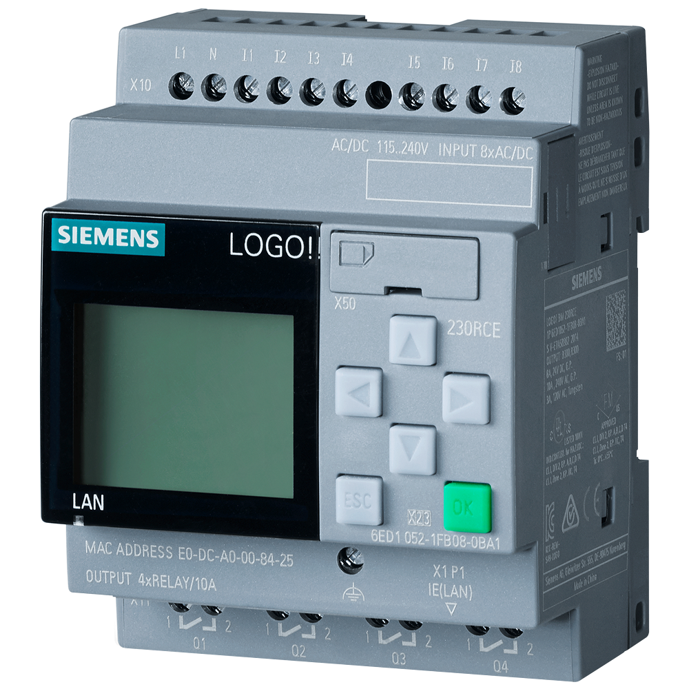 LOGO! 230RCE,logic module, display PS/I/O: 115V/230V/relay, 8 DI/4 DQ, memory 400 blocks, modular expandable, Ethernet, integrated web server, data log, user-defined web pages, standard microSD card for LOGO! Soft Comfort V8.3 or higher, older projects executable cloud connection in all LOGO! 8.3 basic units