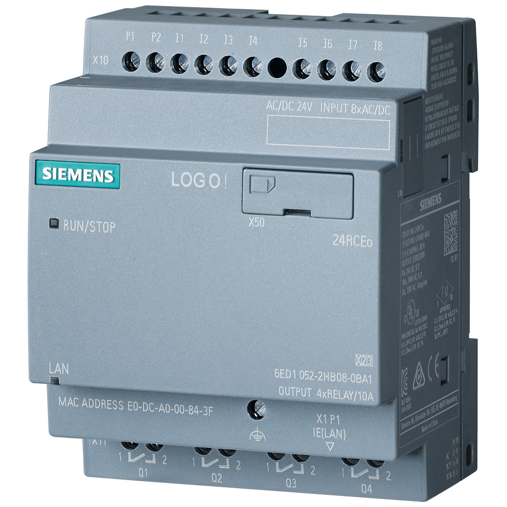 LOGO! 24RCEO (AC), logic module, PS/I/O: DC 24V/24V AC/relay, 8 DI/4 DQ, without display, memory 400 blocks, modular expandable, Ethernet, integrated web server, data log, user-defined web pages, standard microSD card for LOGO! Soft Comfort V8.3 or higher, older projects executable cloud connection in all LOGO! 8.3 basic units