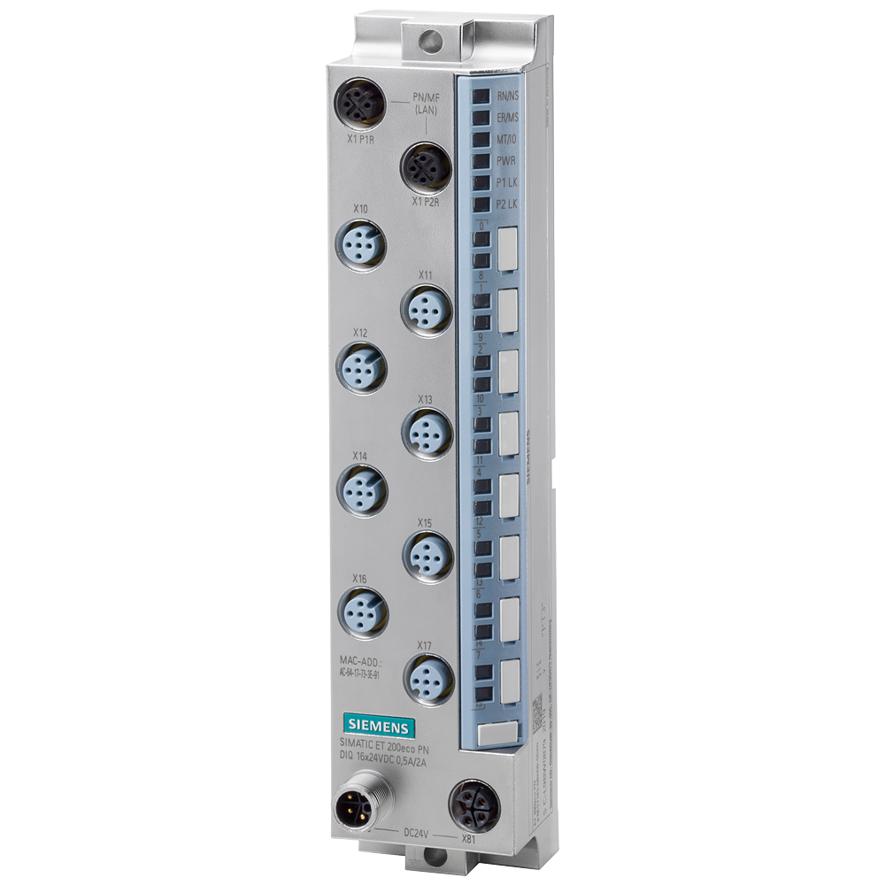 SIMATIC ET 200eco PN, DIQ 16x 24 V DC/0.5 A/2 A, M12-L, 8x M12, double assignment, input type 3 (IEC 61131), sink input (PNP, sinking input), input delay 0.05..20 ms, source output (PNP,switching to P potential), substitute value output, channel diagnostics for: wire break at input, encoder power supply short-circuit, short-circuit at output, prioritized startup, MSI, MSO, MRP, S2 redundancy, I&M0...3, multi-fieldbus, PN IO, Ethernet IP, Modbus TCP, degree of protection IP67 / IP69K