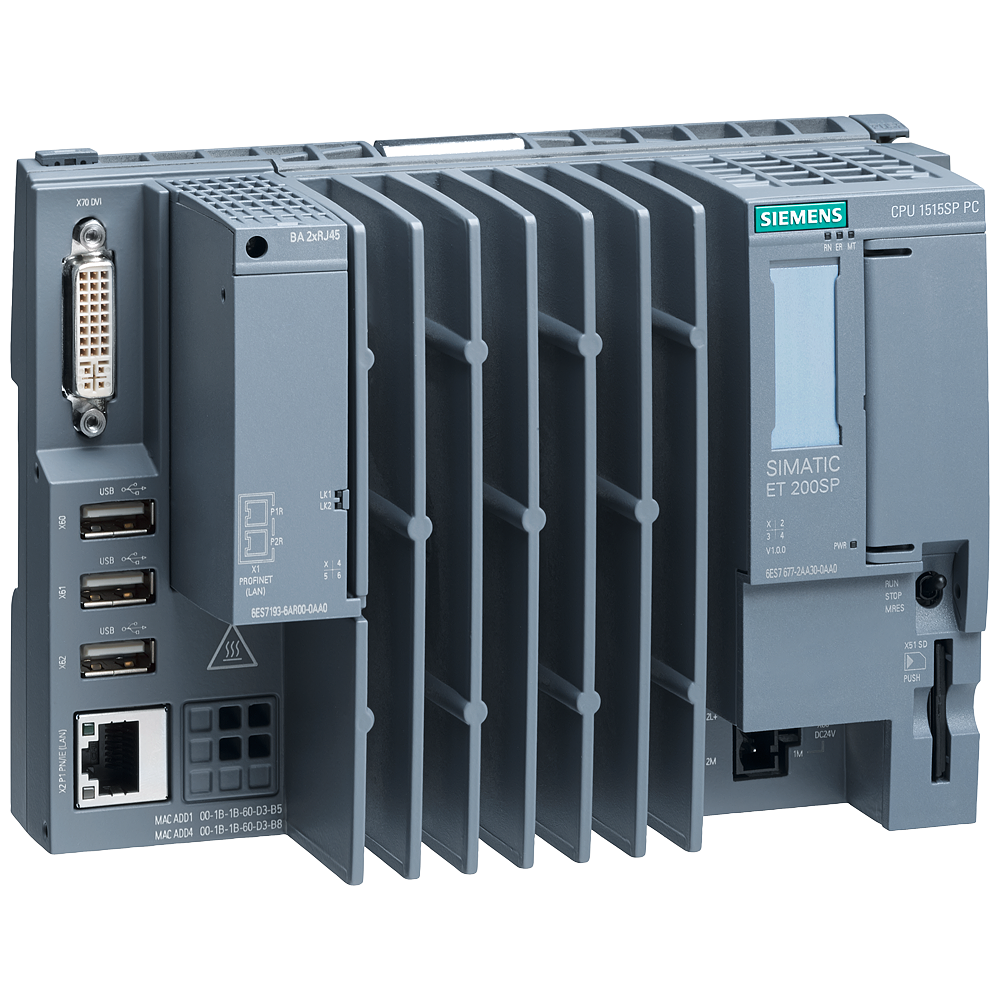 SIMATIC ET 200SP Open Controllers, CPU 1515SP PC. +HMI 512PT, 4 GB RAM, 30 GB CFAST with WES 7 P 64 bit pre-installed, with S7-1500 software controller CPU 1505SP F pre-installed, with WinCC Runtime Advanced V14 pre-installed with 512 PowerTags license, Interfaces: 1x slot CFAST, 1x slot SD/MMC, 1x connection for ET 200SP bus adapter PROFINET 1x 10/100/1000 Mbit/s Ethernet, 3x USB, 1x DVI-I graphics card connection, Documentation on DVD, Restore DVD